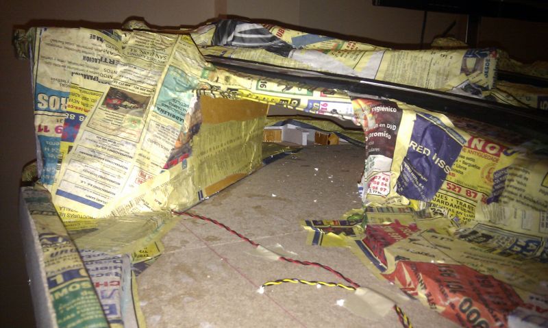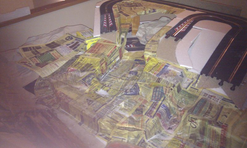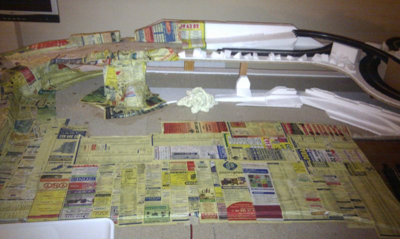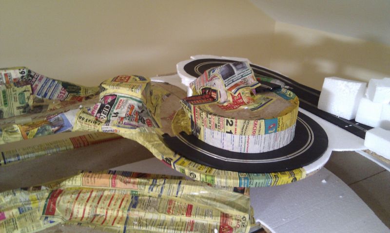 Una vez enrasado todo el circuito, empezamos a construir lo que serán los túneles, puentes, etc... También por probar hemos empezado a forrar todo el circuito con pasta de papel, y el resultado es bastante bueno, salvo por una cosa, el papel ha encorvado el corchod e la base por lo que ahora toca buscar una solucion para ese problema