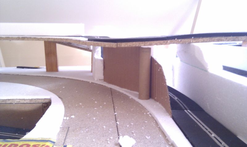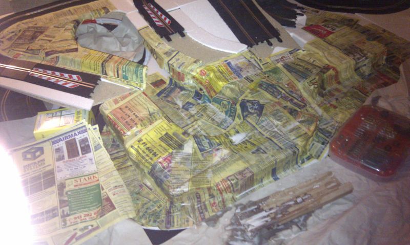 Una vez enrasado todo el circuito, empezamos a construir lo que serán los túneles, puentes, etc... También por probar hemos empezado a forrar todo el circuito con pasta de papel, y el resultado es bastante bueno, salvo por una cosa, el papel ha encorvado el corchod e la base por lo que ahora toca buscar una solucion para ese problema :b_wall: